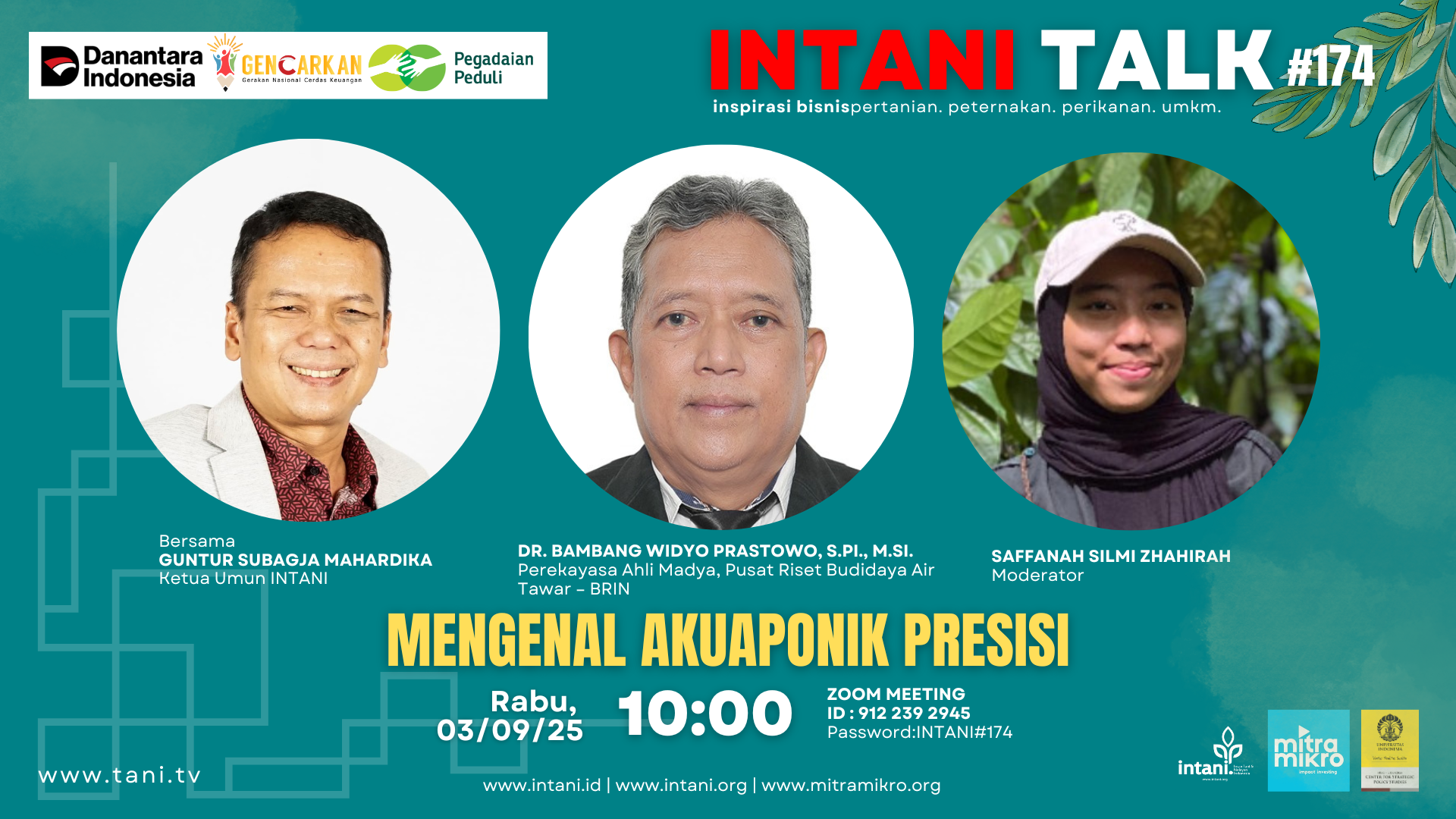 Webinar Intani Talk edisi ke-174 (03/09/2025) kembali digelar dengan topik menarik: “Mengenal Aquaponik Presisi”. Program kolaborasi antara INTANI dan Divisi ESG PT Pegadaian ini menghadirkan Dr. Bambang Widoo Prastowo, S.Si., M.Si., peneliti dari Pusat Riset Budidaya Air Tawar BRIN, yang sudah berpengalaman panjang dalam riset akuakultur dan sistem aquaponik.