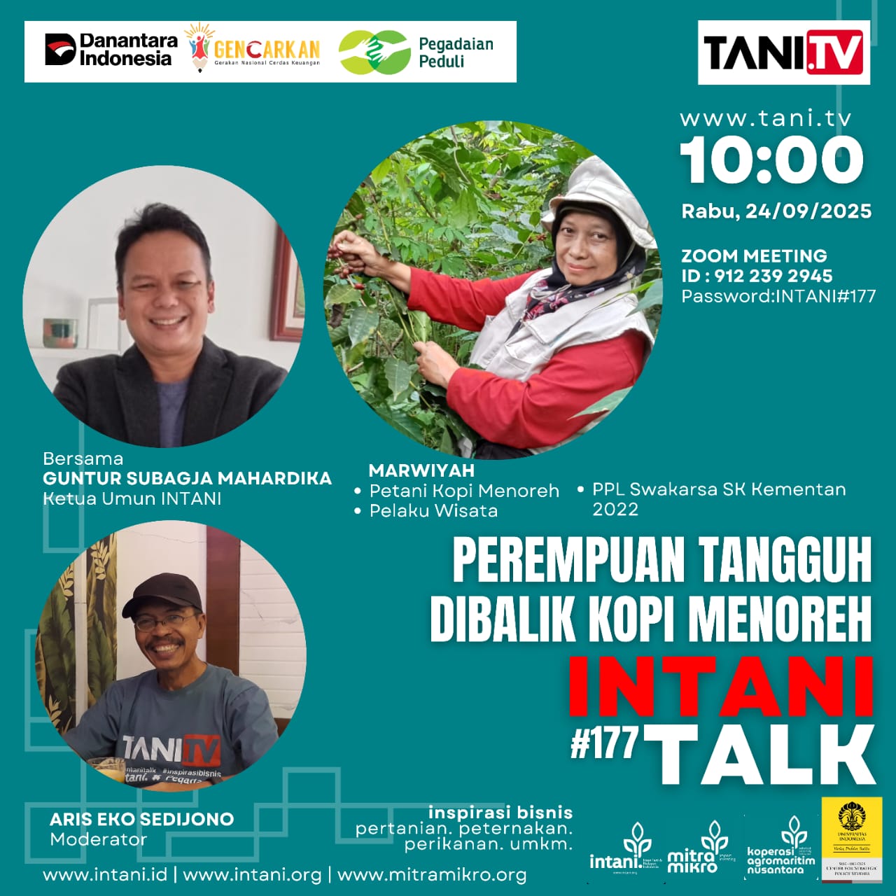 Webinar Intani Talk edisi ke-177 menghadirkan kisah inspiratif Mbak Marwiyah, pemilik  Warung Kopi Menoreh dari Kulon Progo, Daerah Istimewa Yogyakarta. Dengan dipandu moderator Pak Aris, sesi ini mengupas perjalanan panjang Mbak Marwiyah membangun usaha kopi sekaligus pariwisata edukasi yang memberdayakan petani dan perempuan di pedesaan.